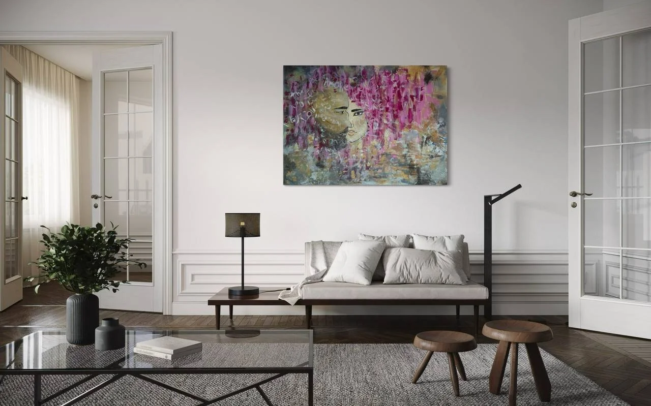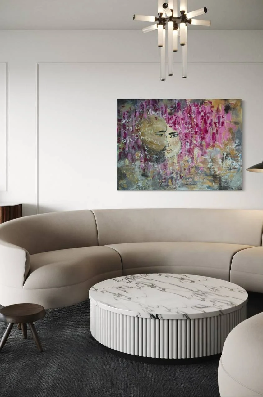Abstract shades of pink and gold blend seamlessly to form two intertwined faces, representing the beauty of connection and the power of love. Delicate layers and textures evoke unity, compassion, and emotional depth.