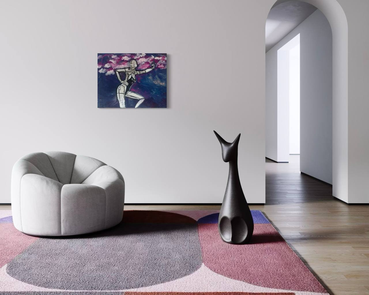 A futuristic figure stands against a vibrant backdrop of deep blues and pink clouds, boldly gesturing with a stance that exudes defiance and self-assurance.