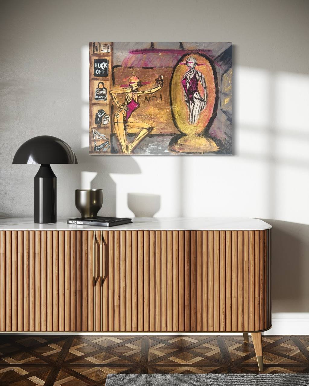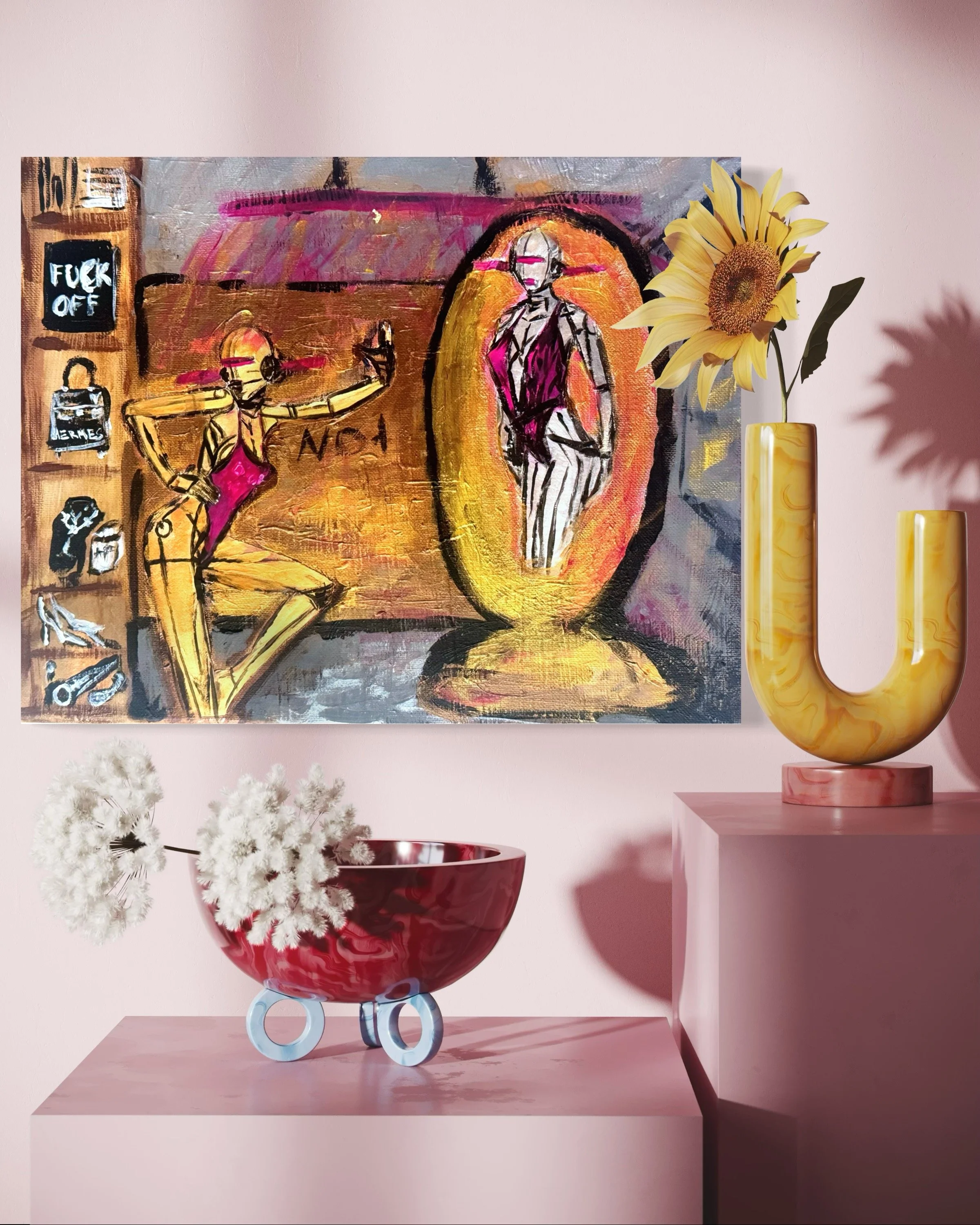A robotic figure strikes a confident pose in front of a golden mirror, surrounded by elements of luxury and rebellion, including bold text and iconic symbols.