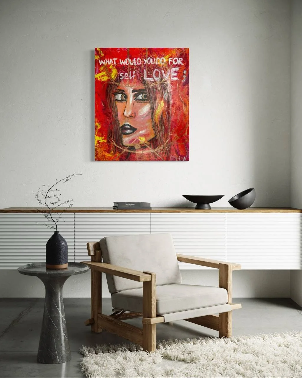 A striking portrait of a woman gazes intently at the viewer, framed by fiery reds and yellows. The phrase “What would you do for self-love?” is boldly inscribed across the top, prompting introspection and empowerment. Delicate gold accents weave through the composition, adding depth and a sense of renewal.